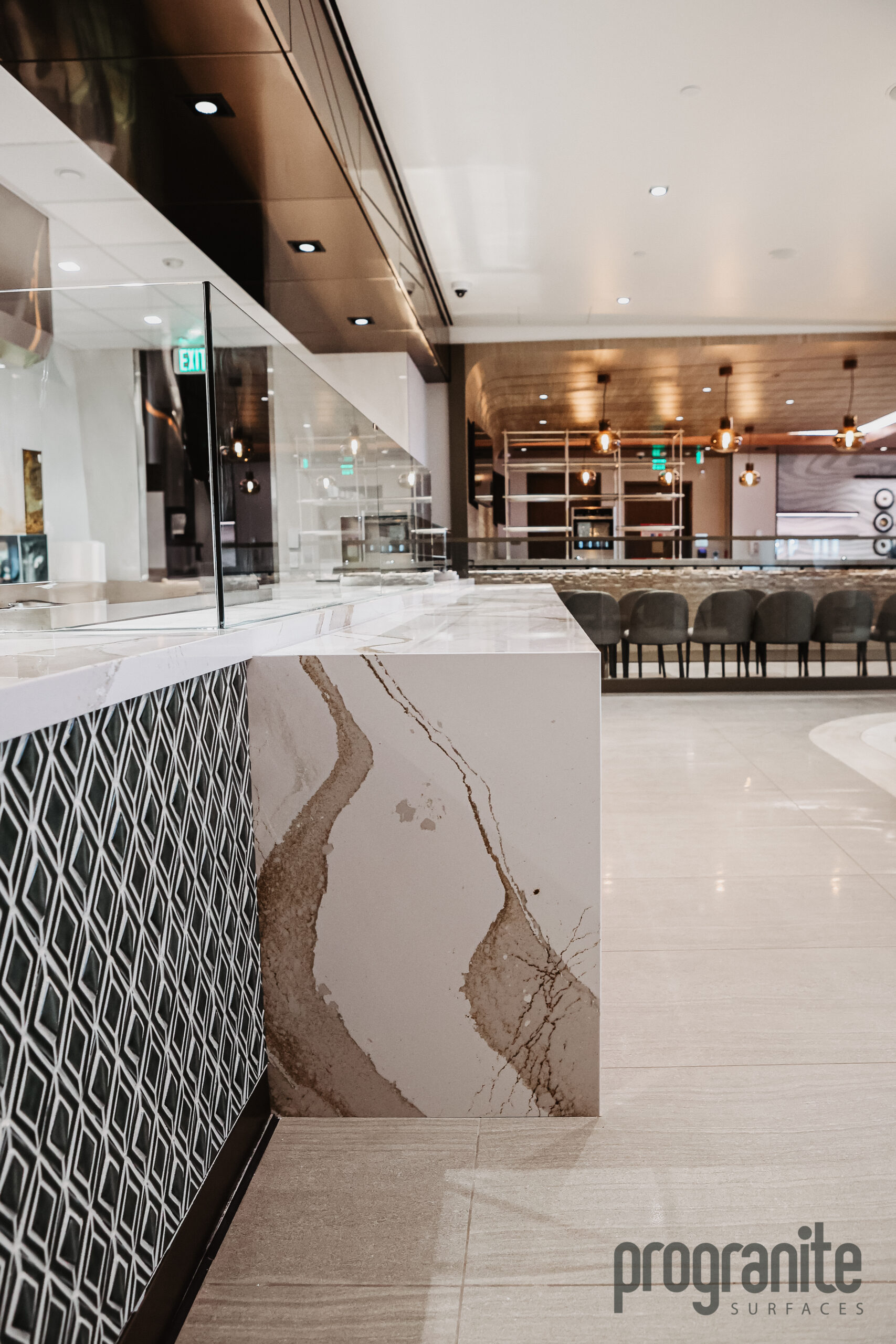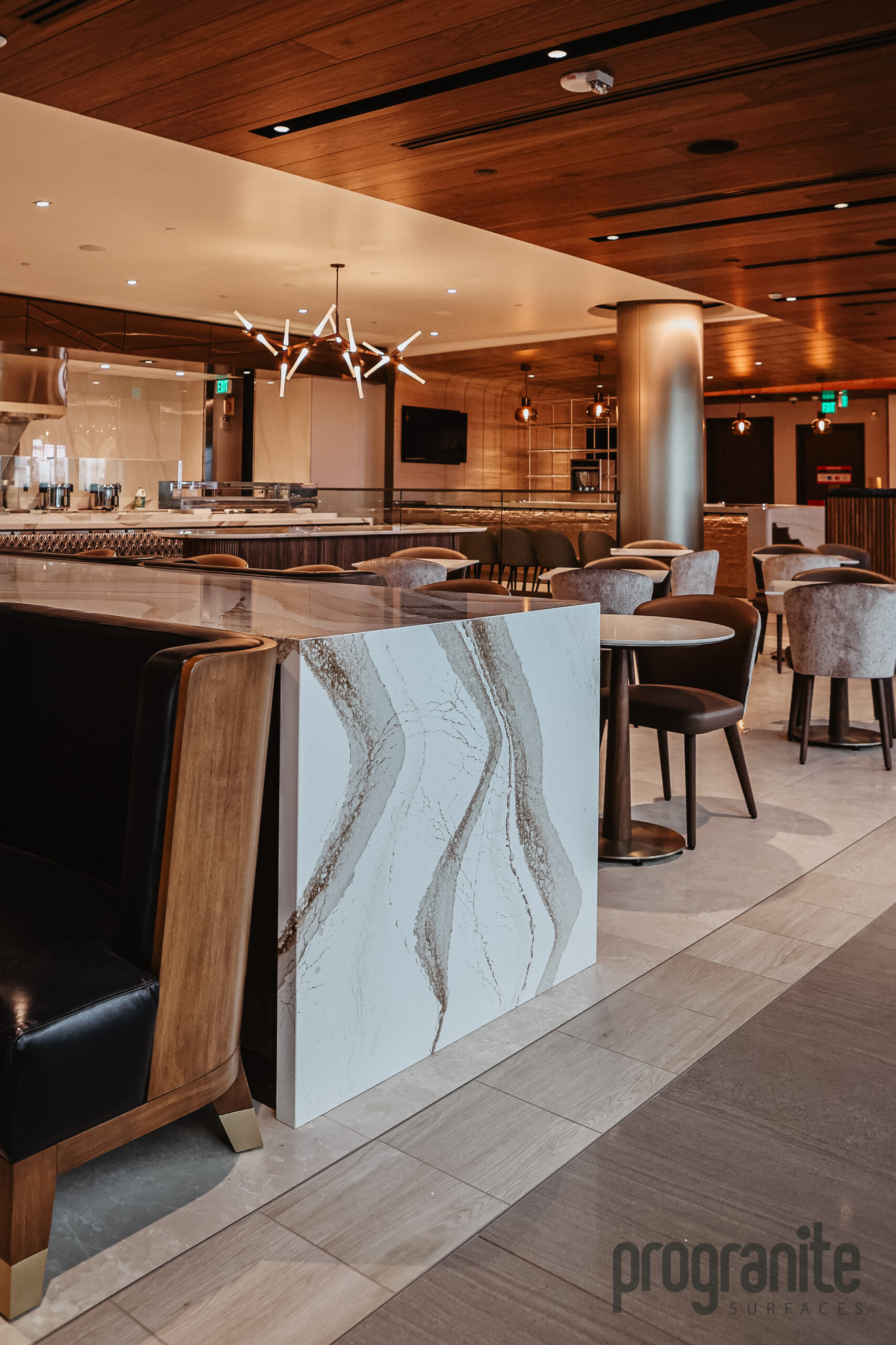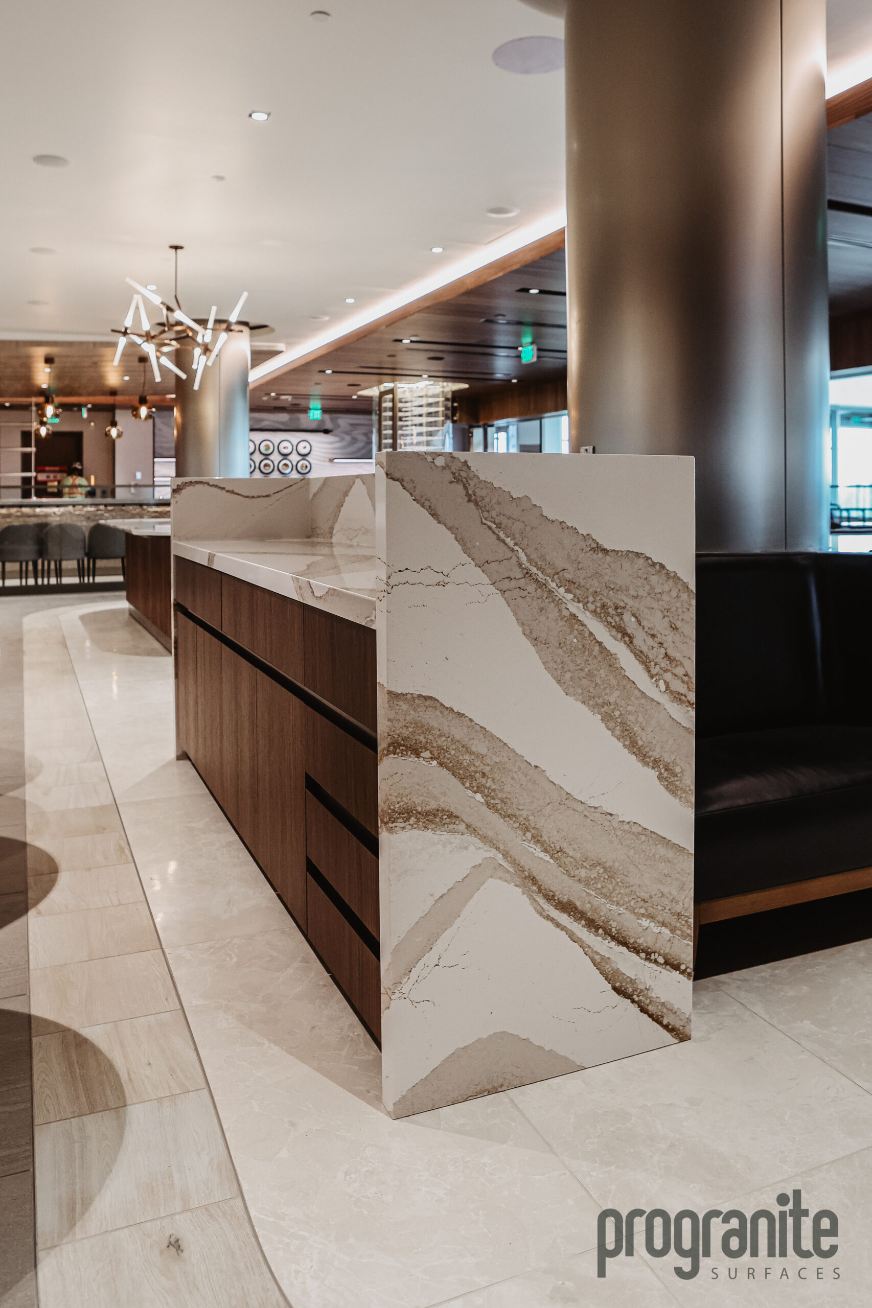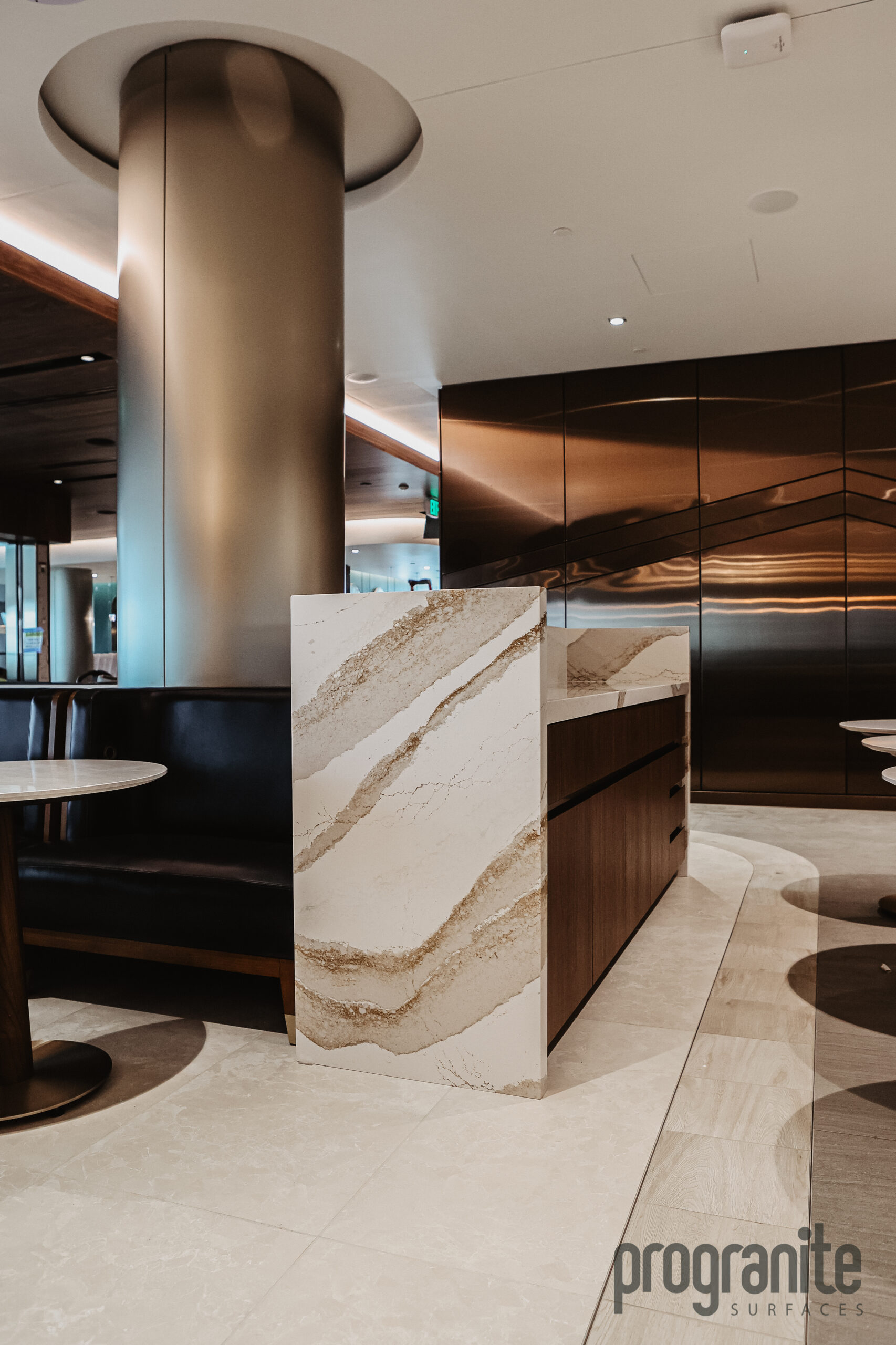 Luxury Aesthetic: Cambria’s unique patterns add elegance to the lounge’s atmosphere.