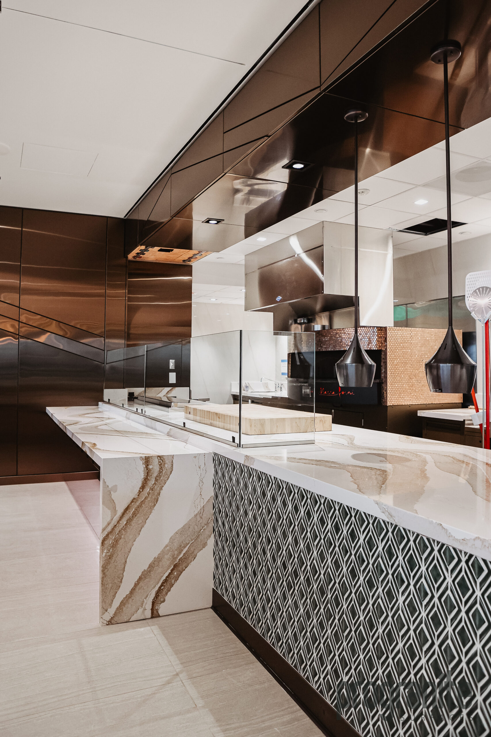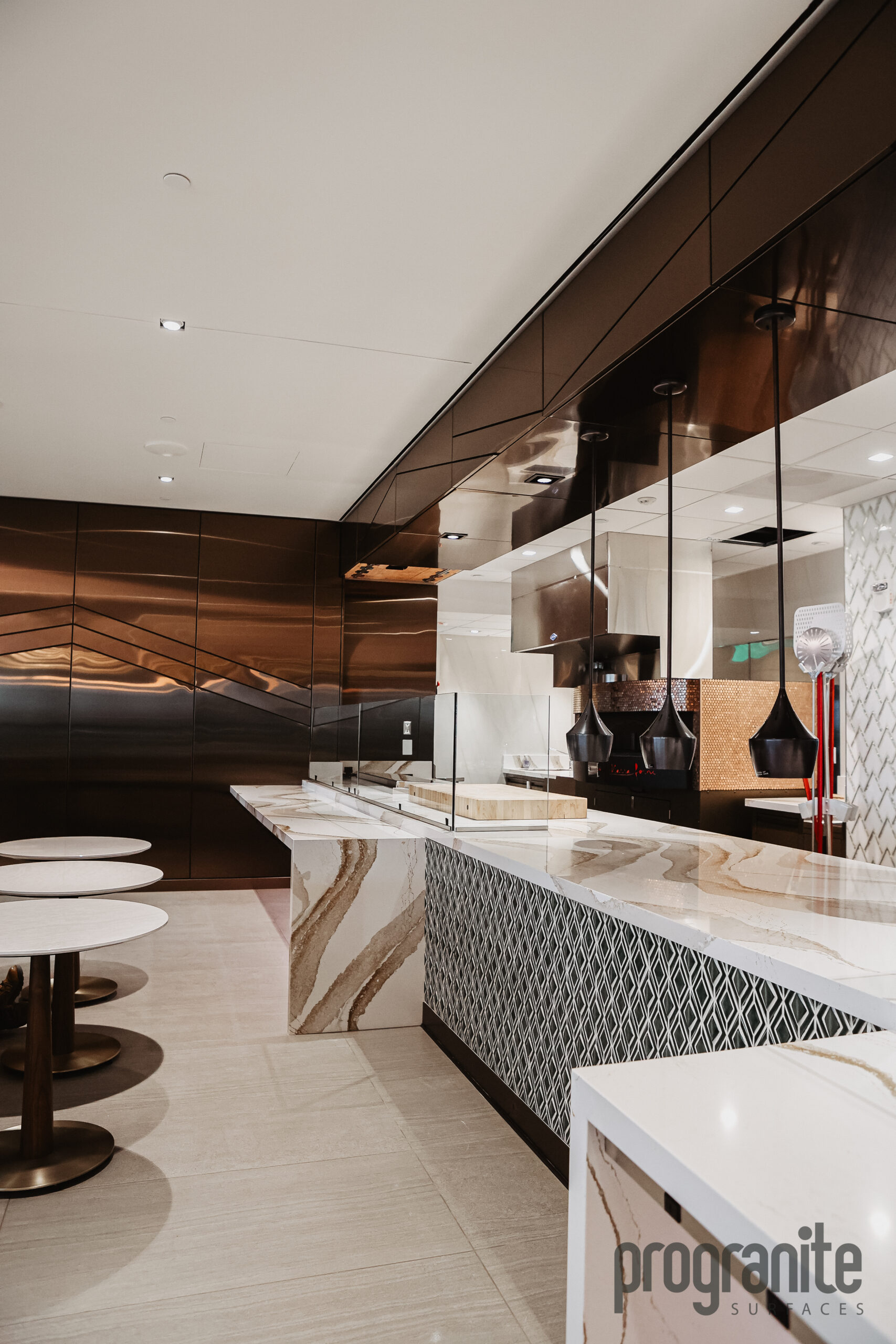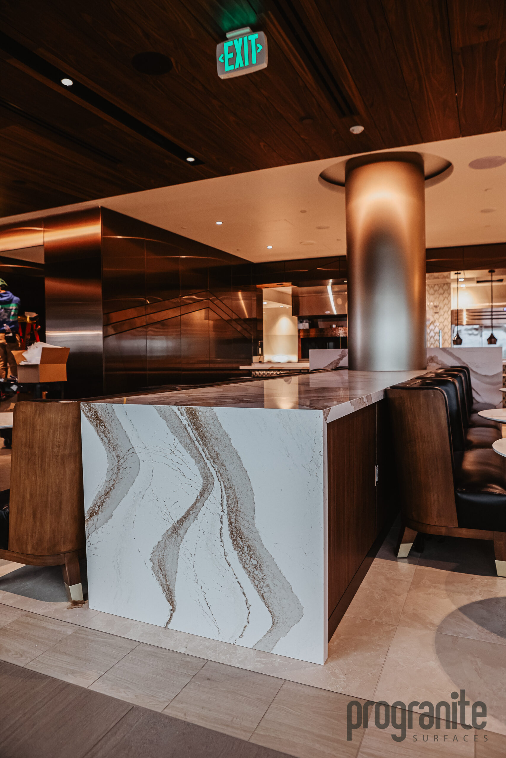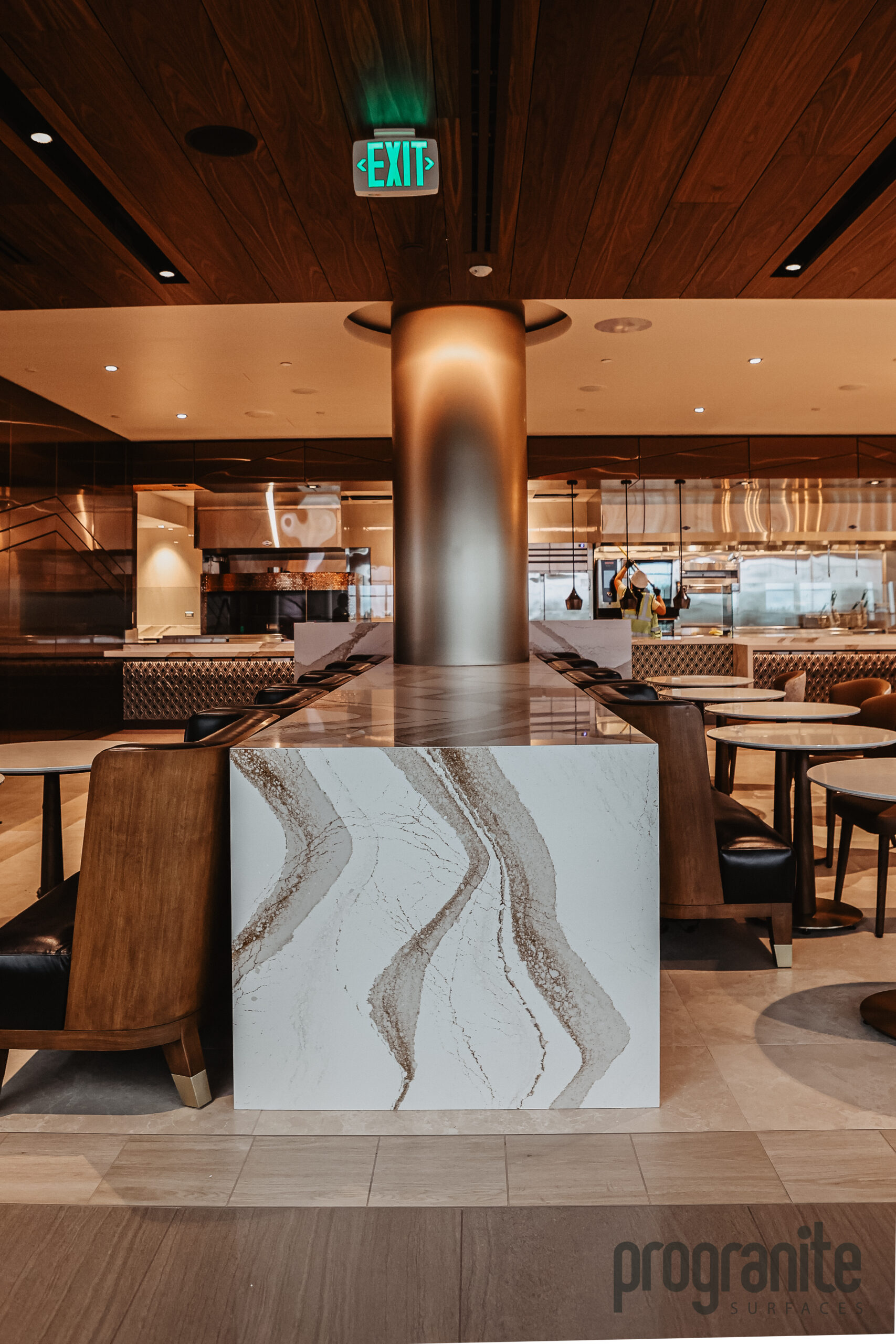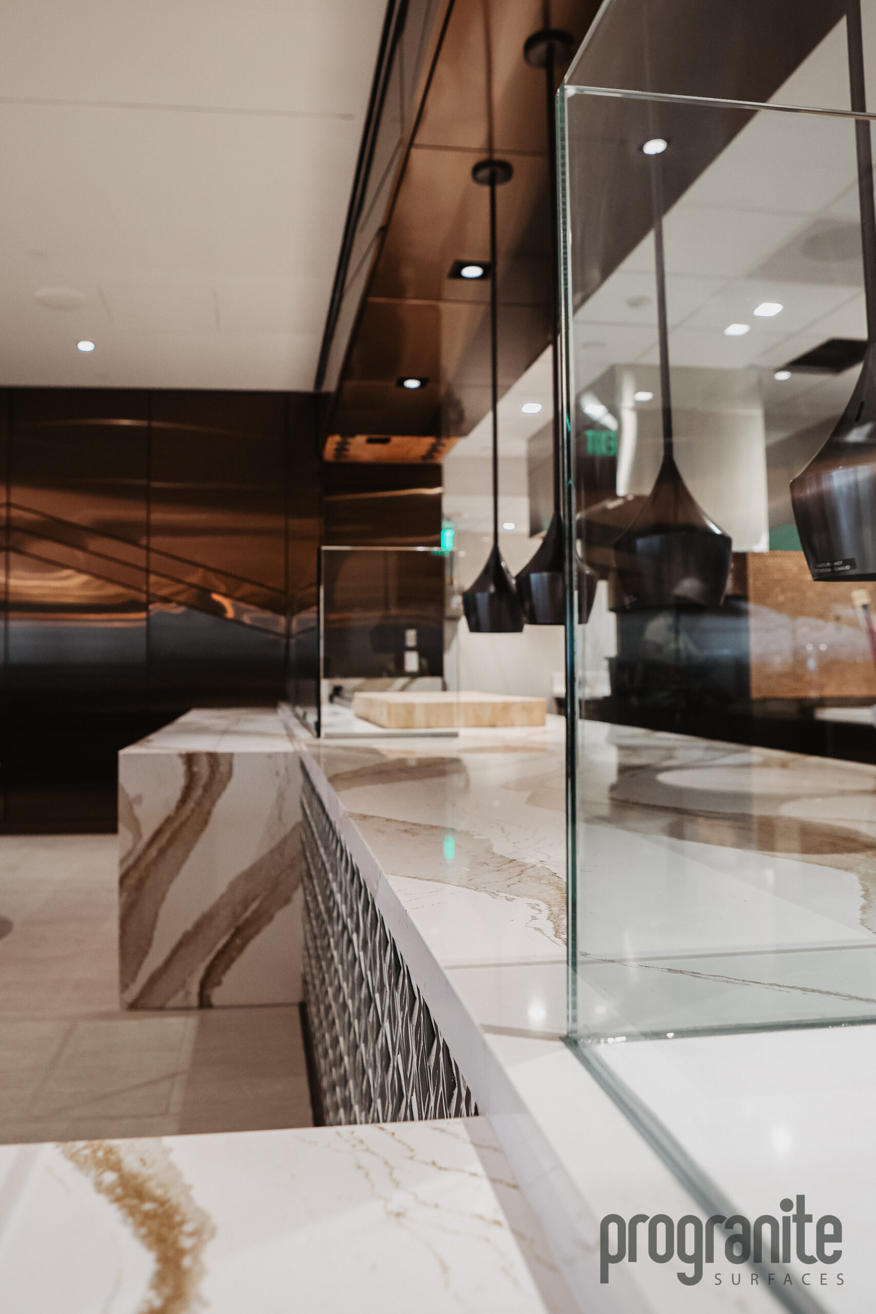 Luxury Aesthetic: Cambria’s unique patterns add elegance to the lounge’s atmosphere.