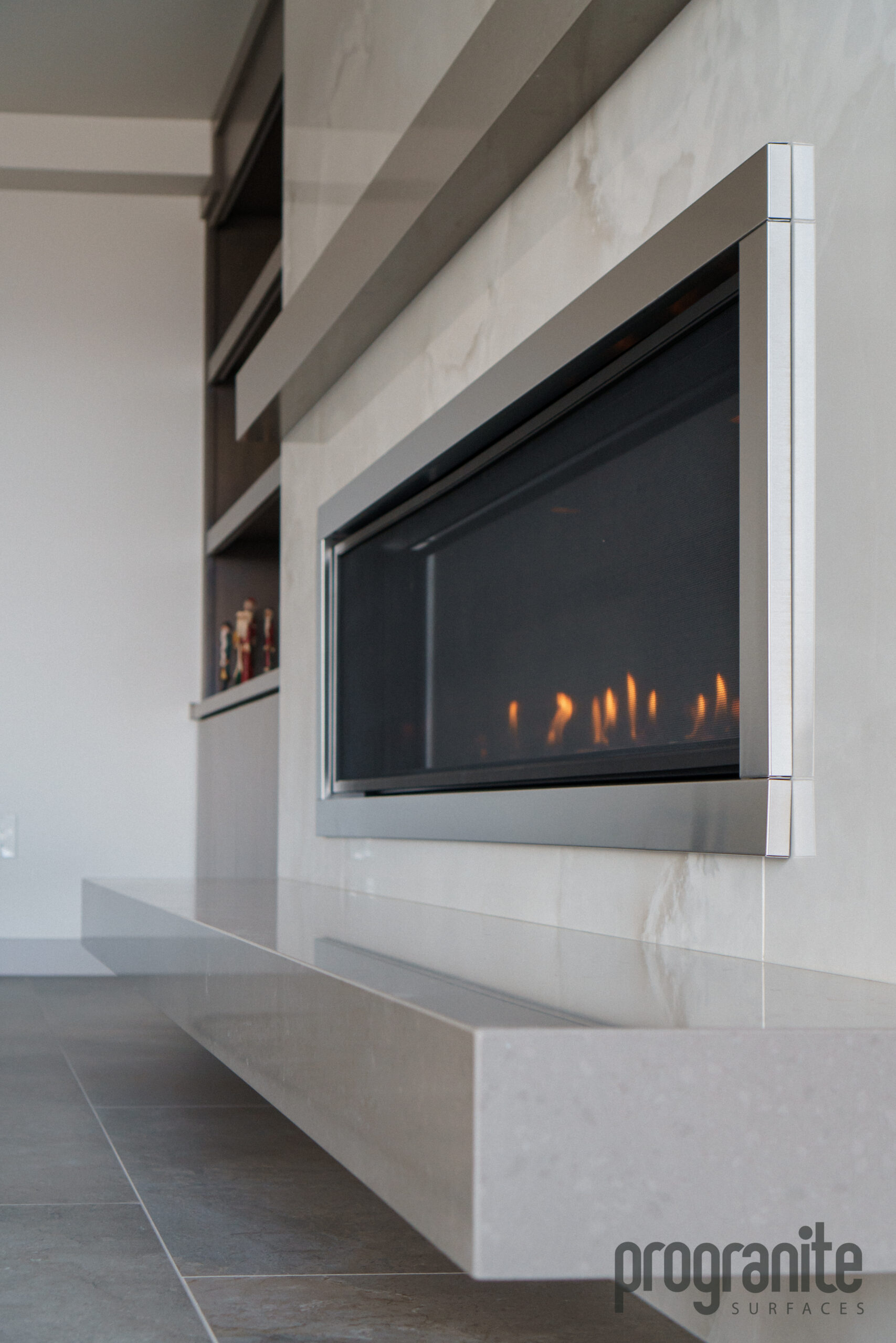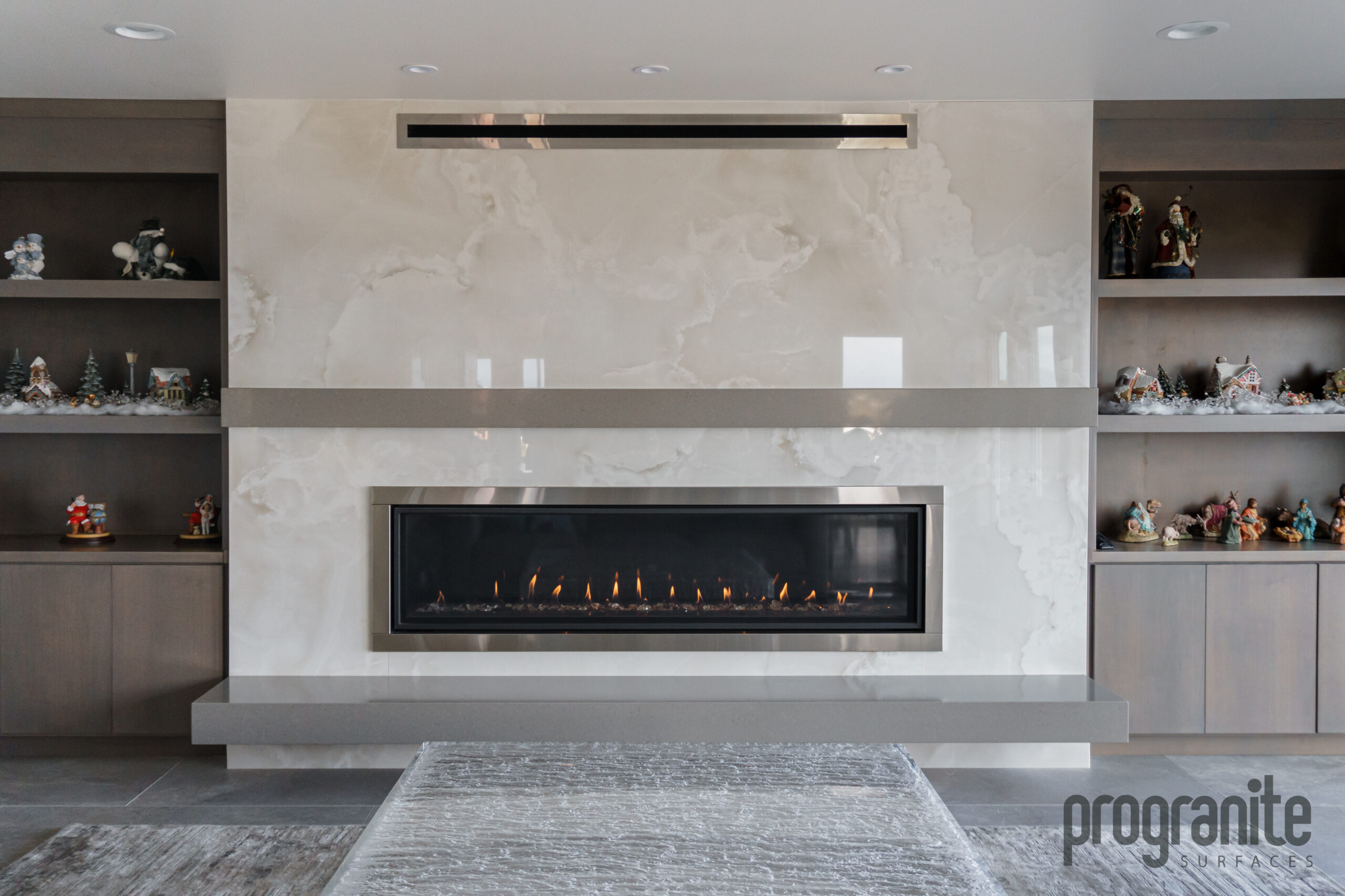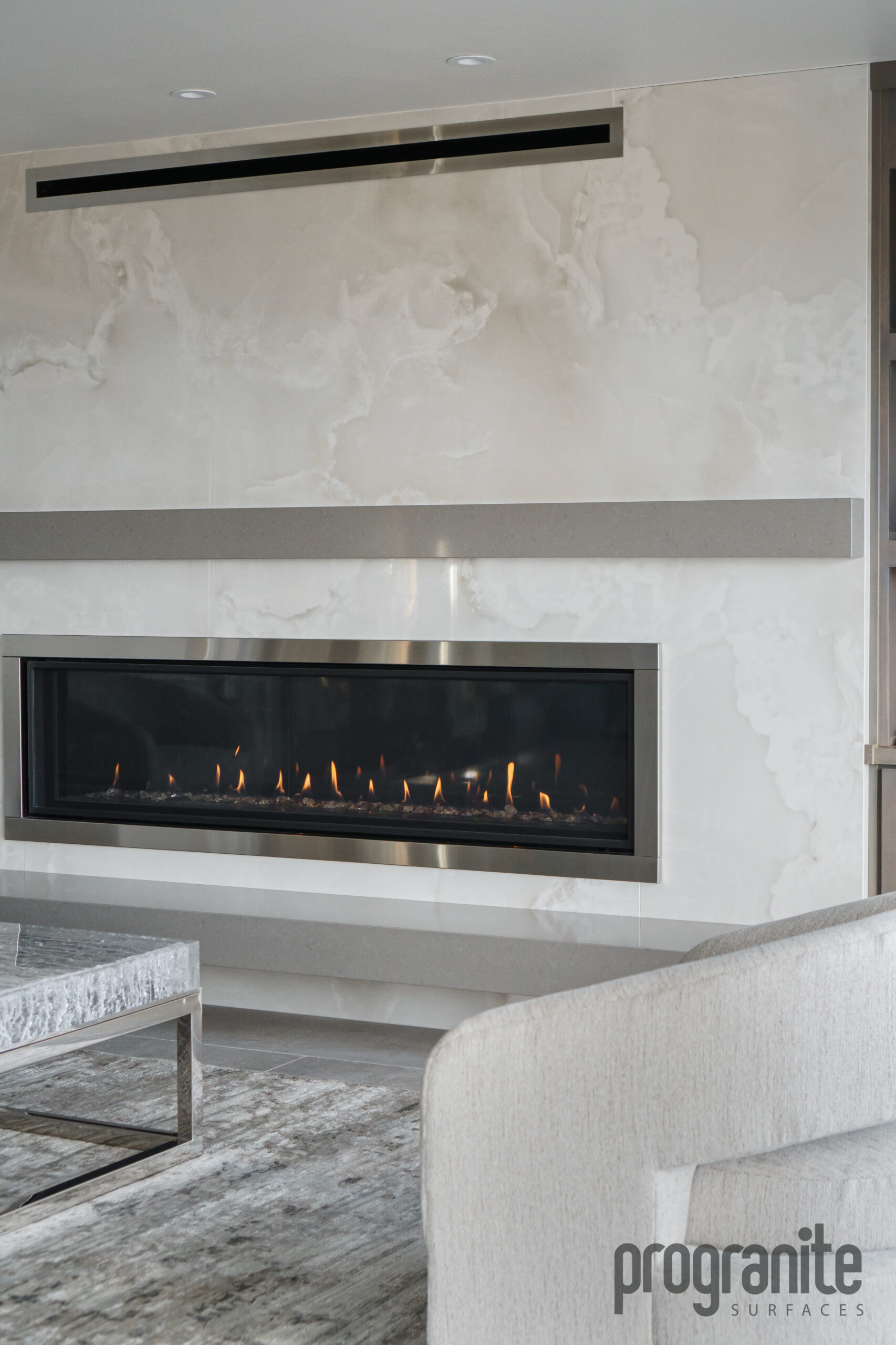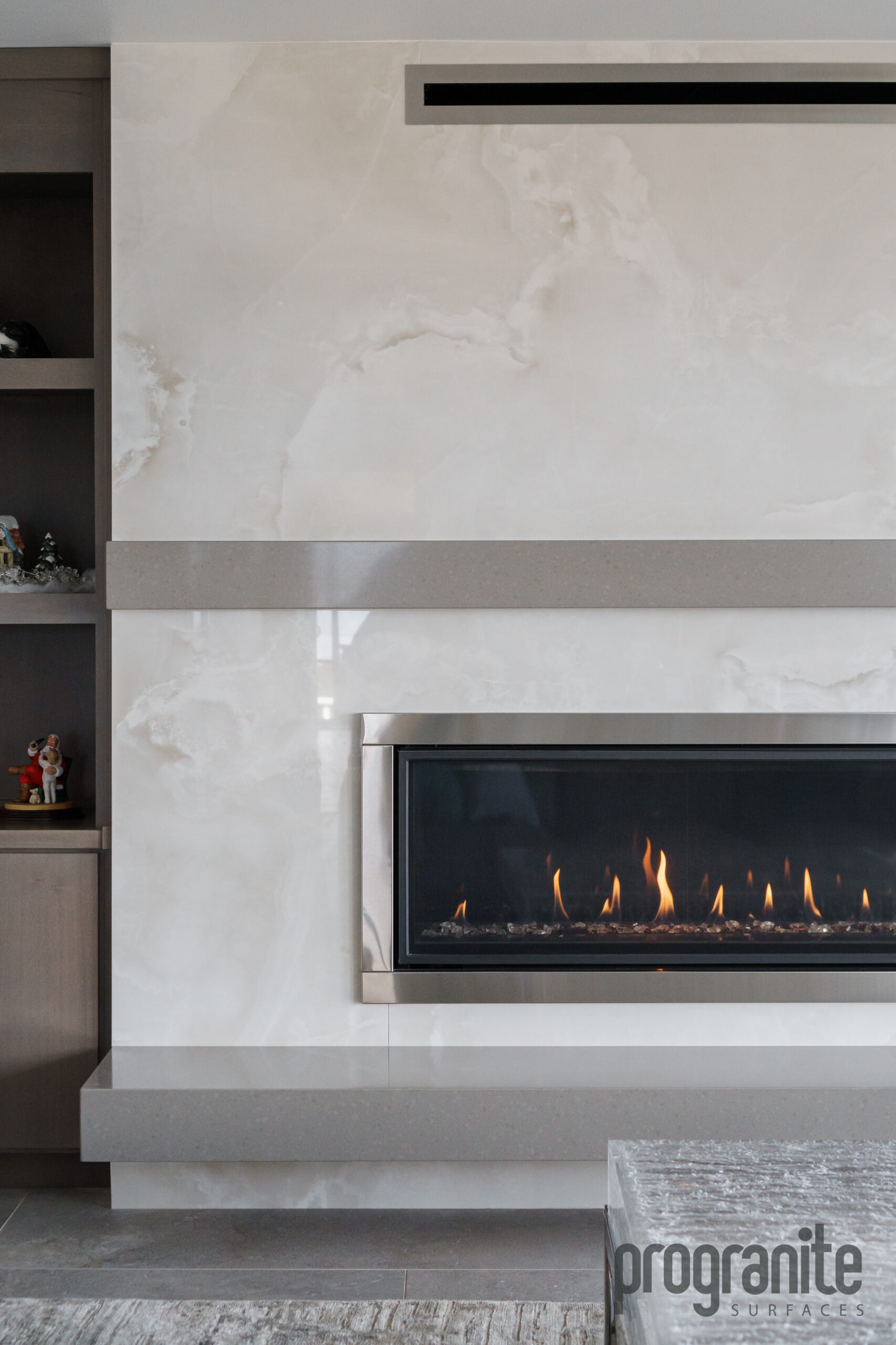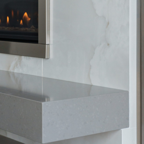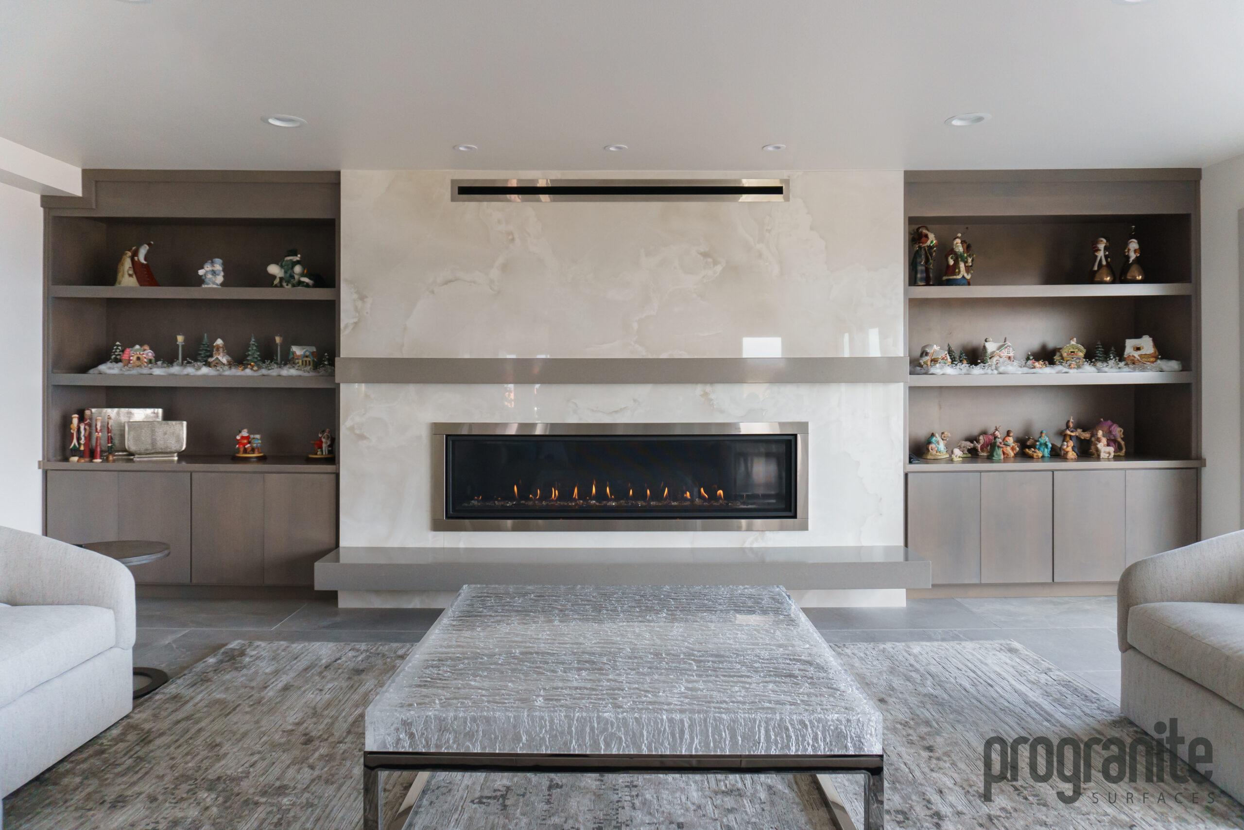 This elegant project showcases a seamless blend of modern design and timeless materials. The living room features a stunning fireplace wall clad in Dekton Helena Polished, paired with a matching hearth and mantle in MSI Concerto Polished, creating a sleek focal point that extends from floor to ceiling for a full-height backsplash effect around the fire feature. In the restroom, the white quartz restroom design shines with Porcelain Carrara Blanco shower walls, accented by bold gray veining that adds visual depth and luxury. The warm gray cabinetry and built-in shower shelf complement the tones of the shower wall, bringing balance and cohesion to the space while maintaining a sophisticated, contemporary aesthetic.