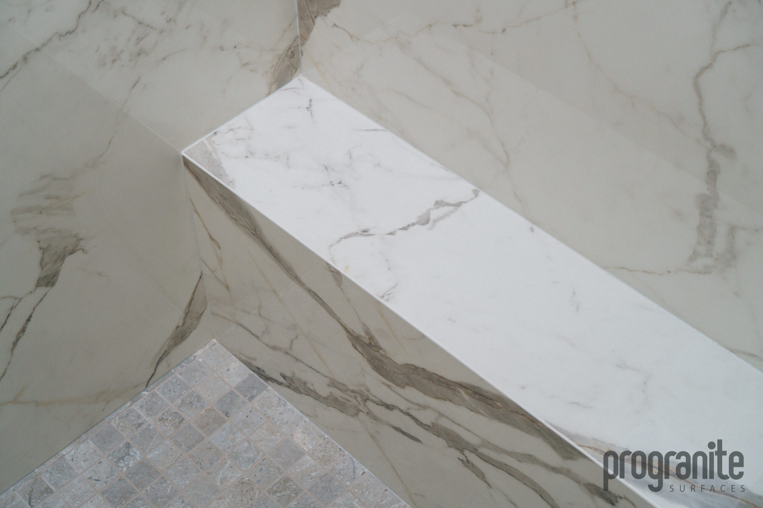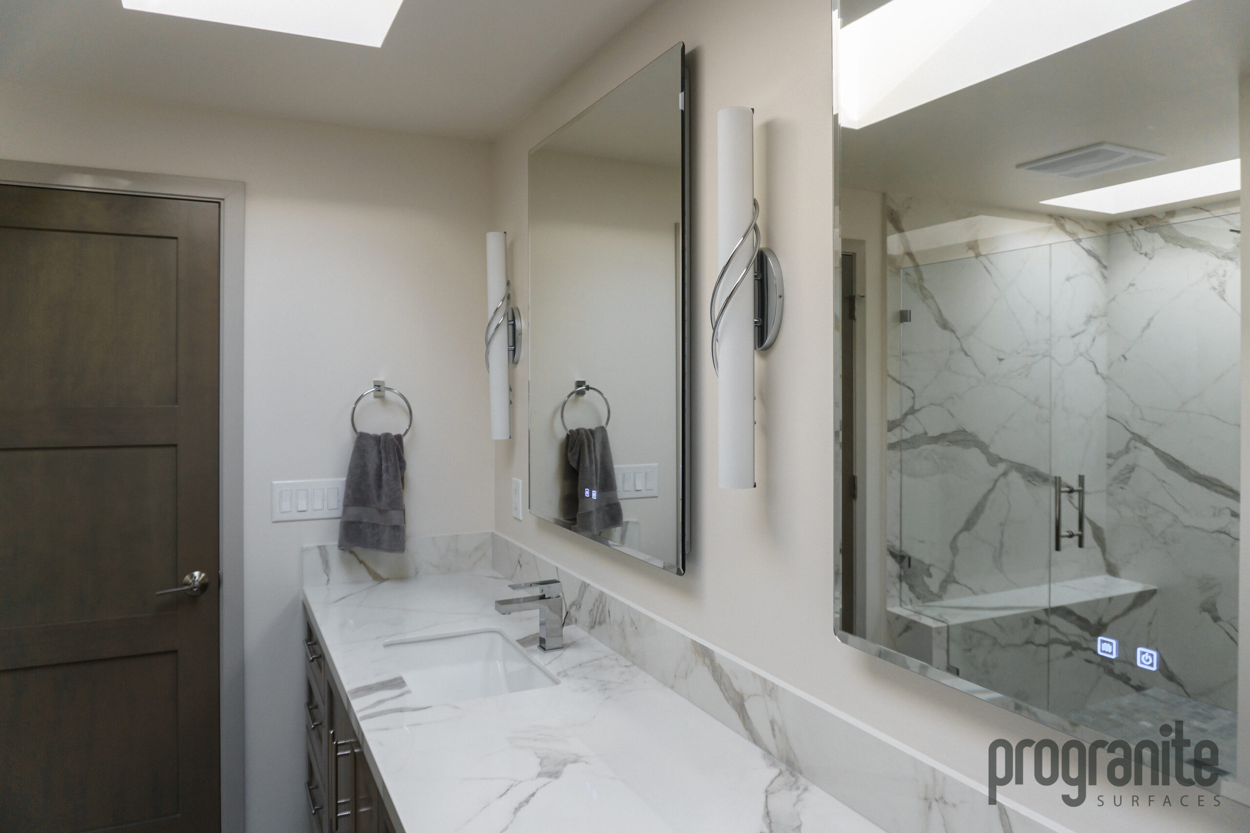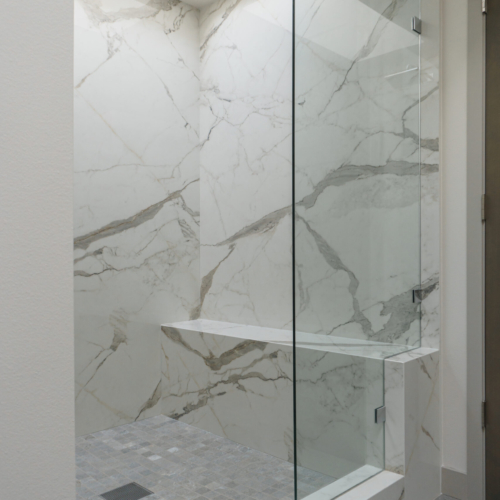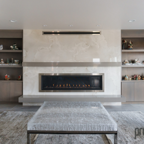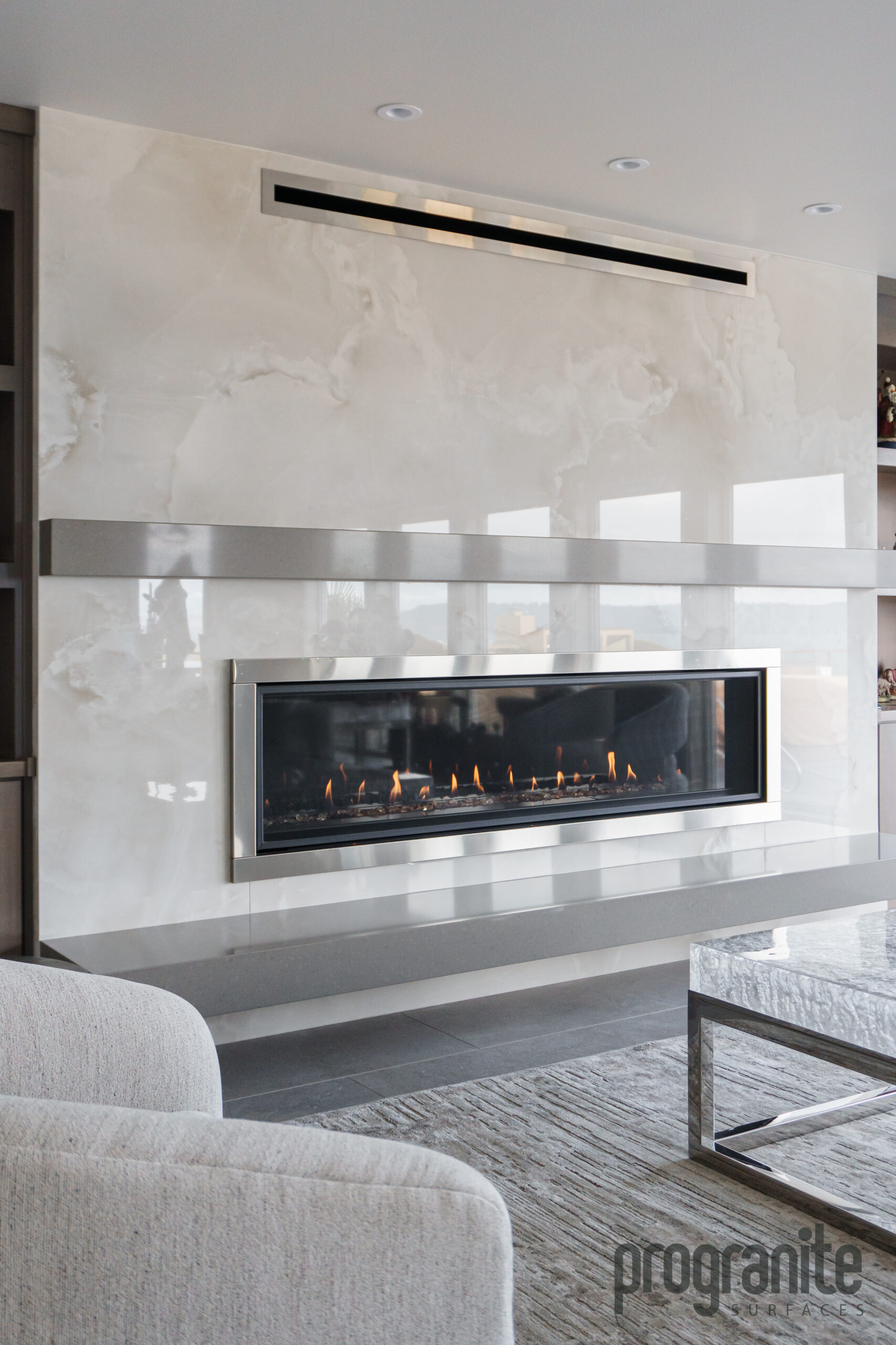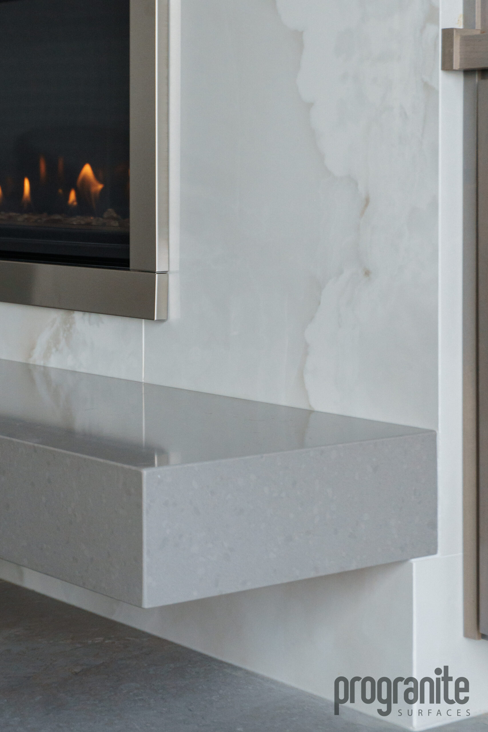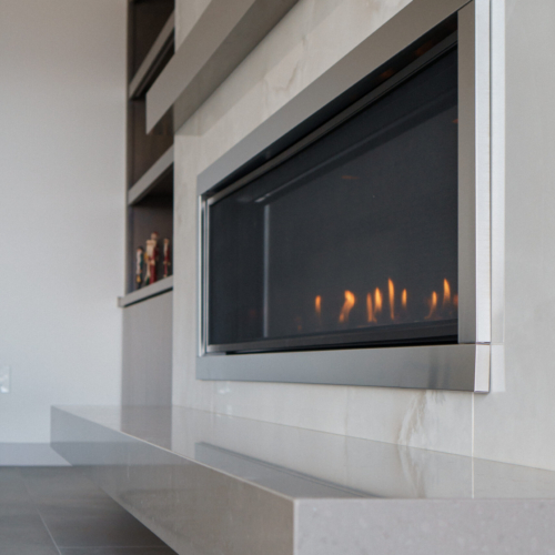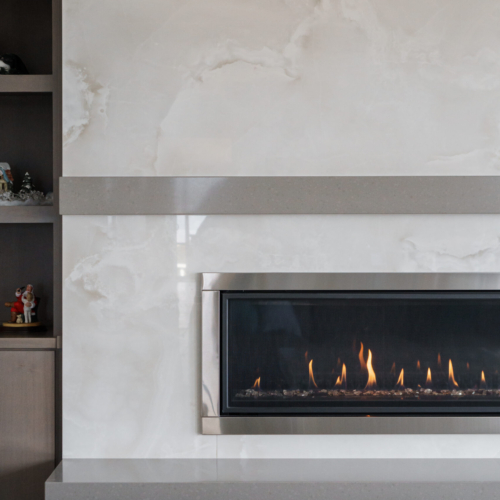 This elegant project showcases a seamless blend of modern design and timeless materials. The living room features a stunning fireplace wall clad in Dekton Helena Polished, paired with a matching hearth and mantle in MSI Concerto Polished, creating a sleek focal point that extends from floor to ceiling for a full-height backsplash effect around the fire feature. In the restroom, the white quartz restroom design shines with Porcelain Carrara Blanco shower walls, accented by bold gray veining that adds visual depth and luxury. The warm gray cabinetry and built-in shower shelf complement the tones of the shower wall, bringing balance and cohesion to the space while maintaining a sophisticated, contemporary aesthetic.