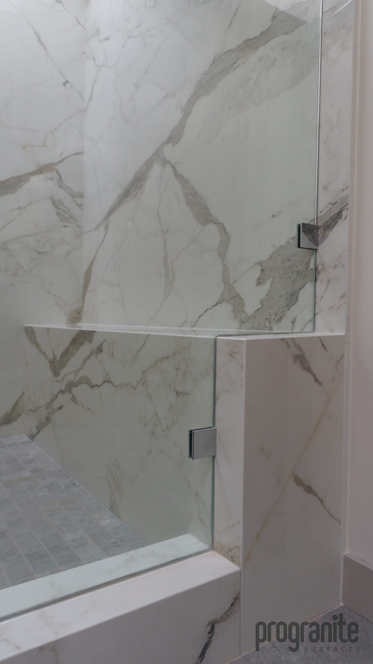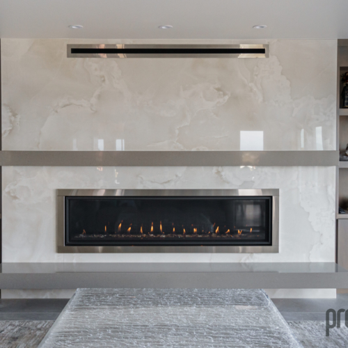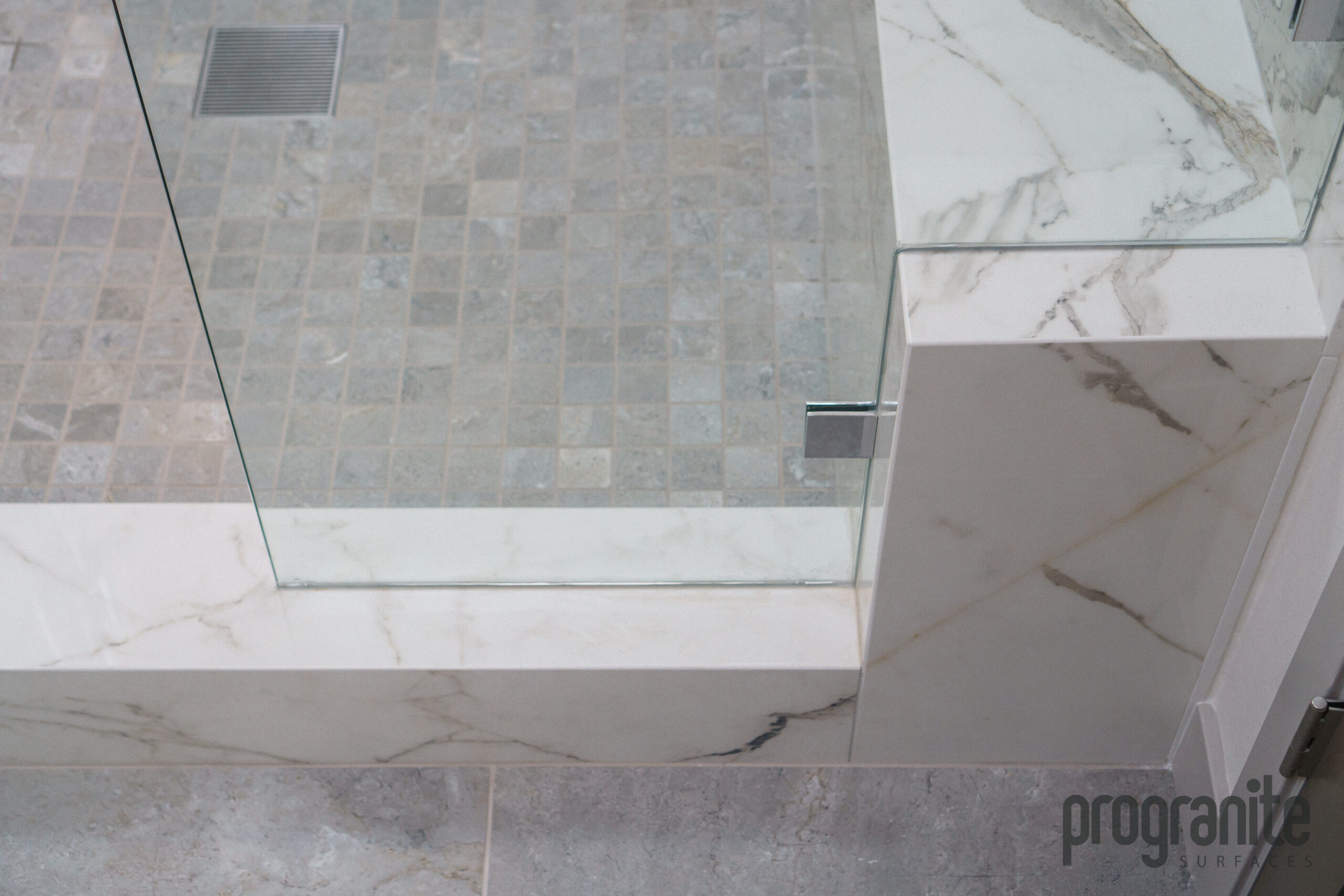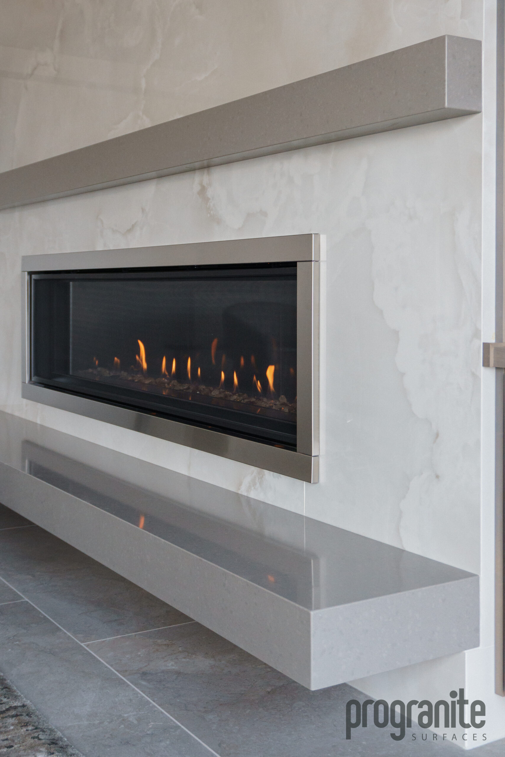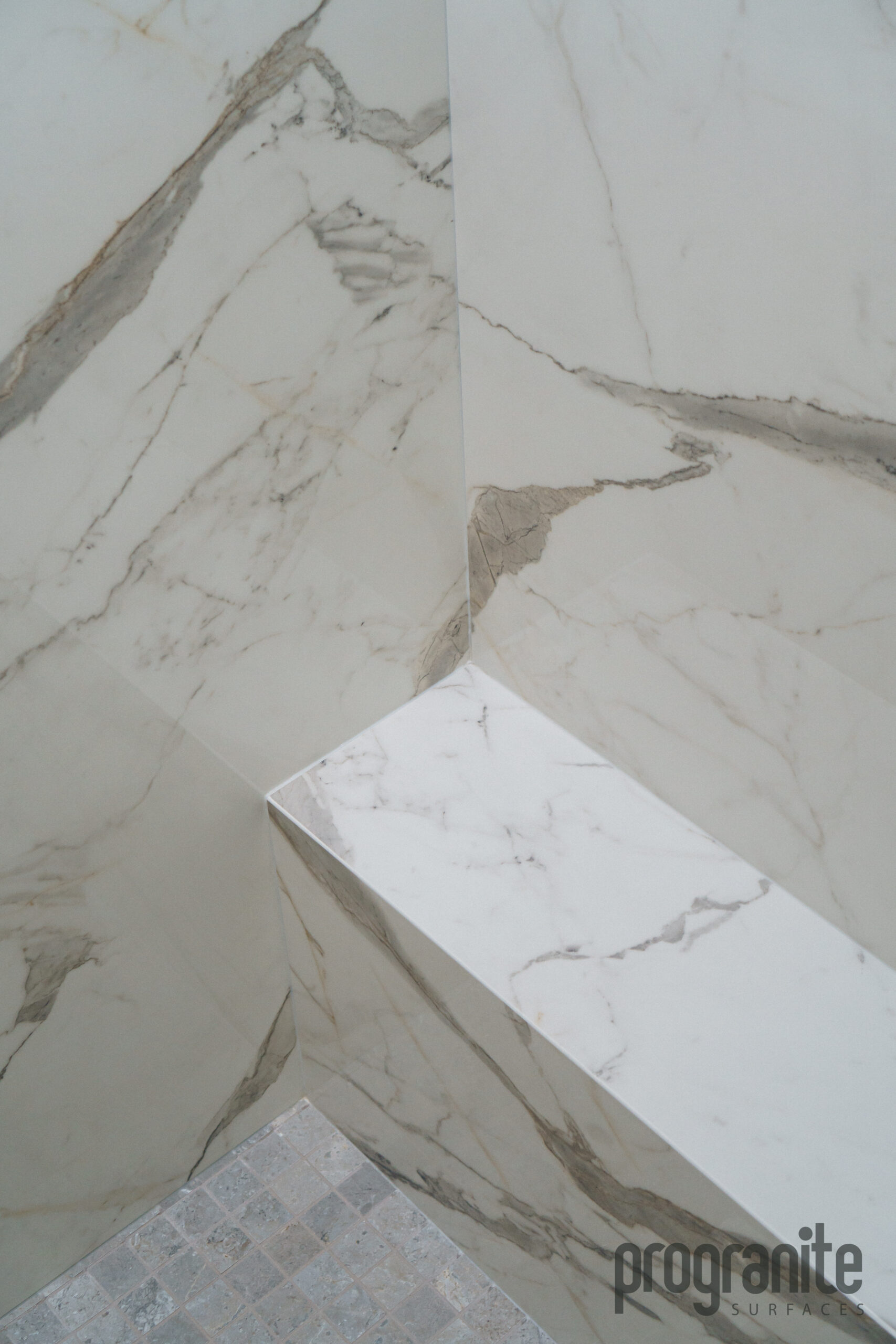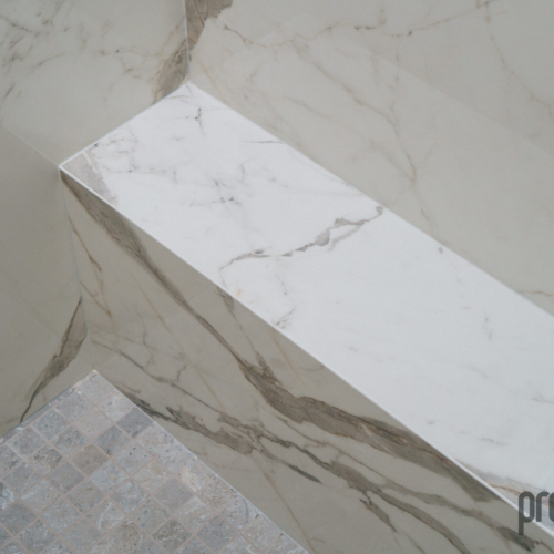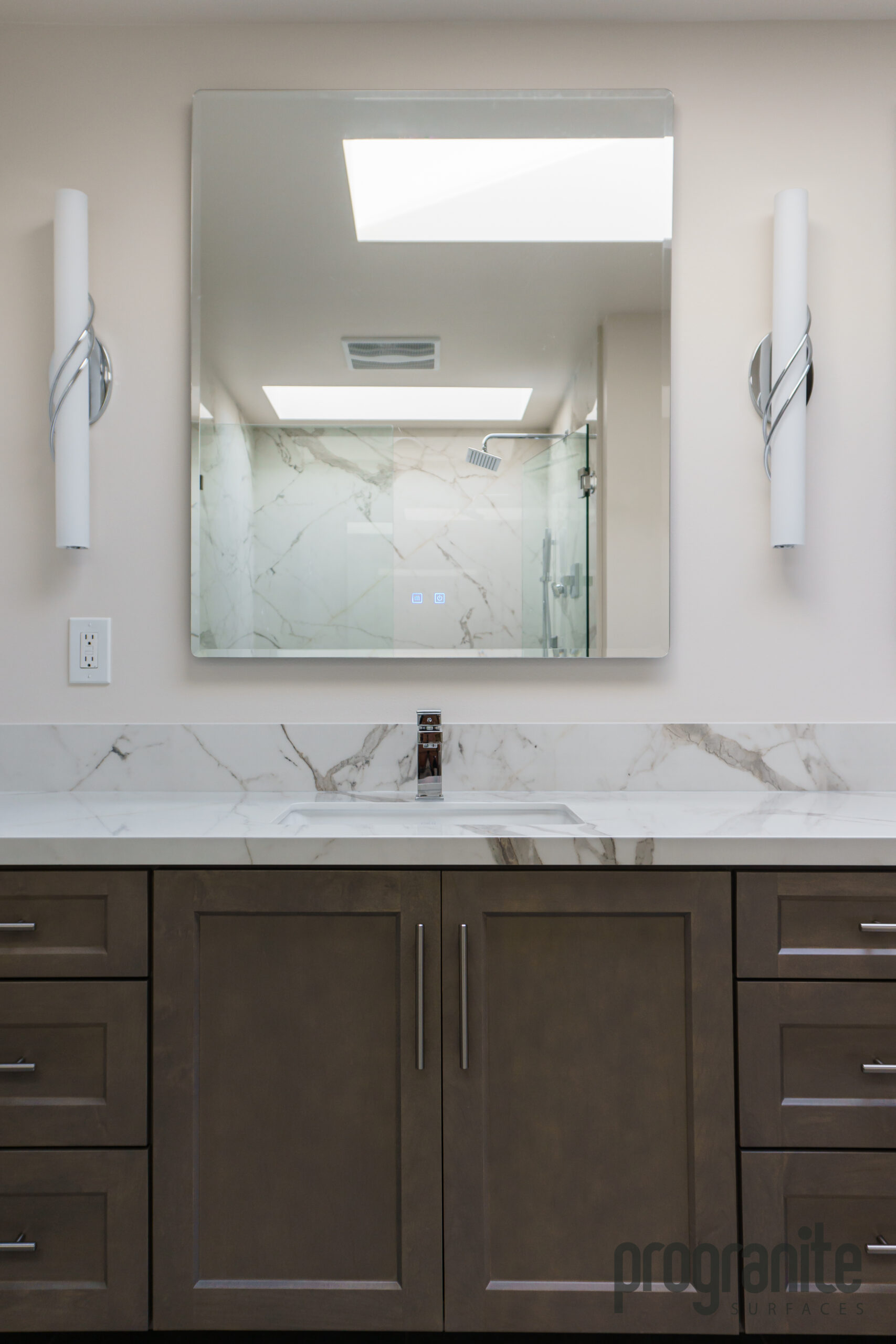 This elegant project showcases a seamless blend of modern design and timeless materials. The living room features a stunning fireplace wall clad in Dekton Helena Polished, paired with a matching hearth and mantle in MSI Concerto Polished, creating a sleek focal point that extends from floor to ceiling for a full-height backsplash effect around the fire feature. In the restroom, the white quartz restroom design shines with Porcelain Carrara Blanco shower walls, accented by bold gray veining that adds visual depth and luxury. The warm gray cabinetry and built-in shower shelf complement the tones of the shower wall, bringing balance and cohesion to the space while maintaining a sophisticated, contemporary aesthetic.