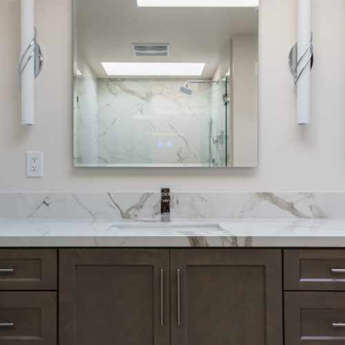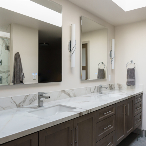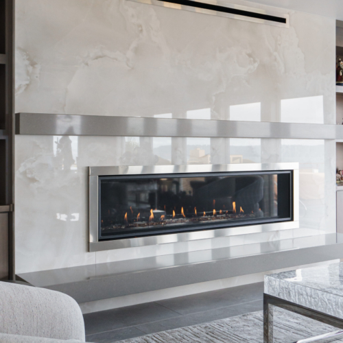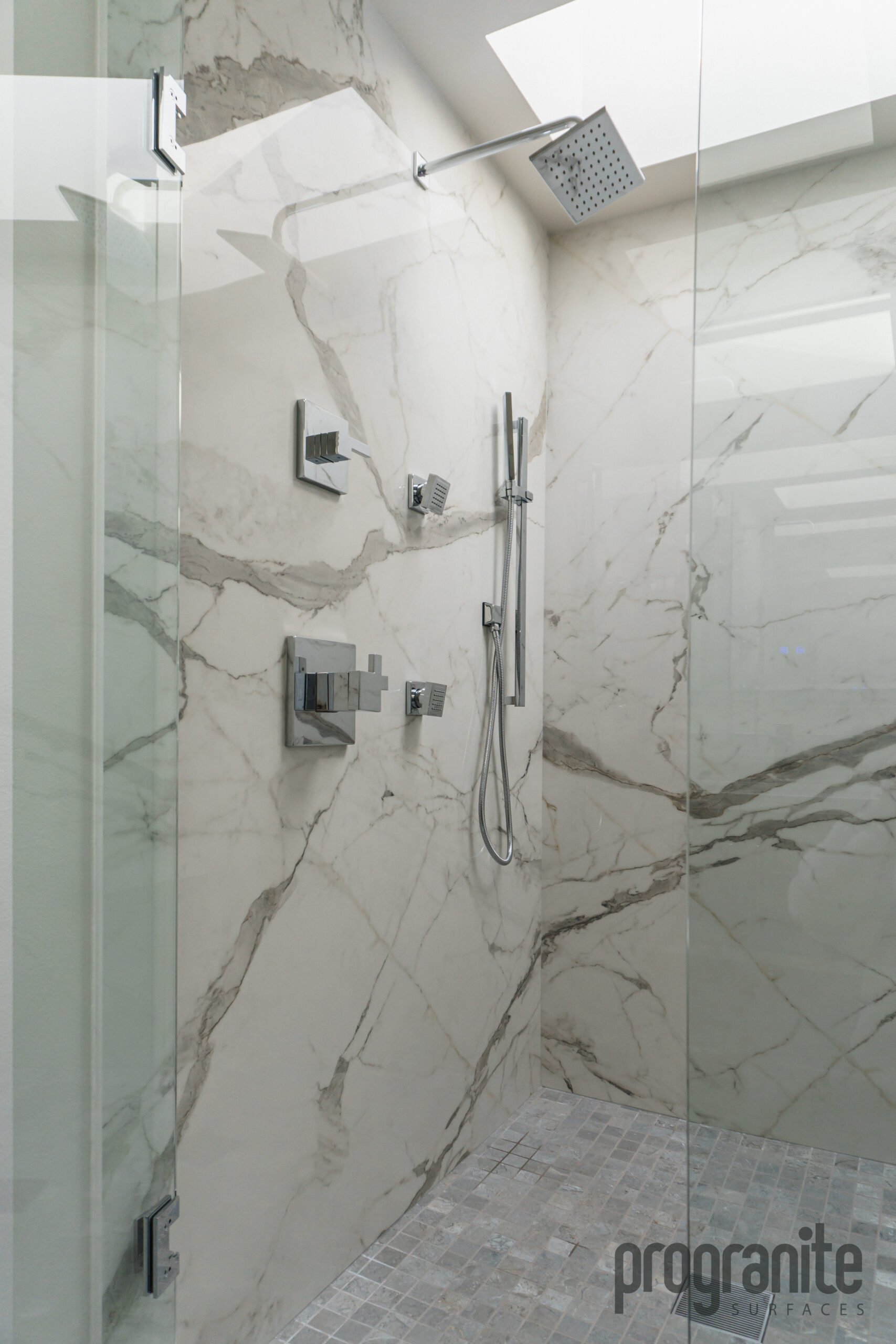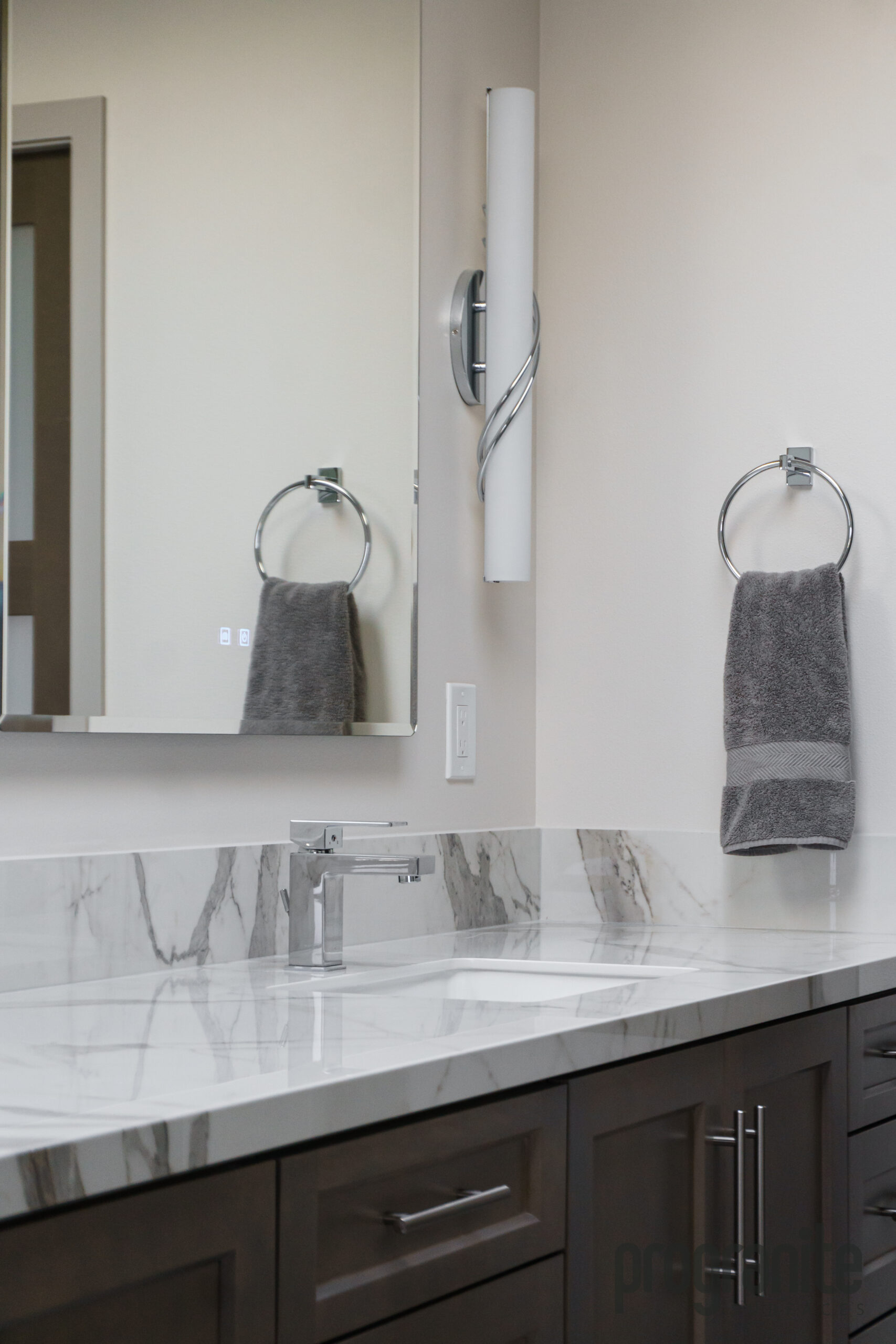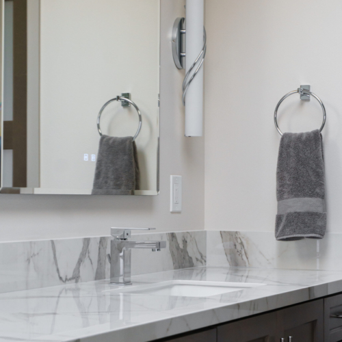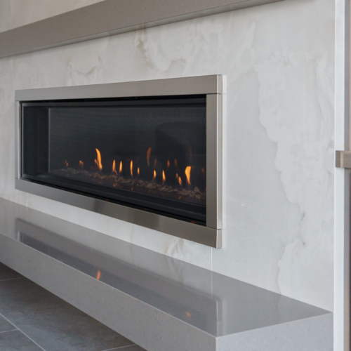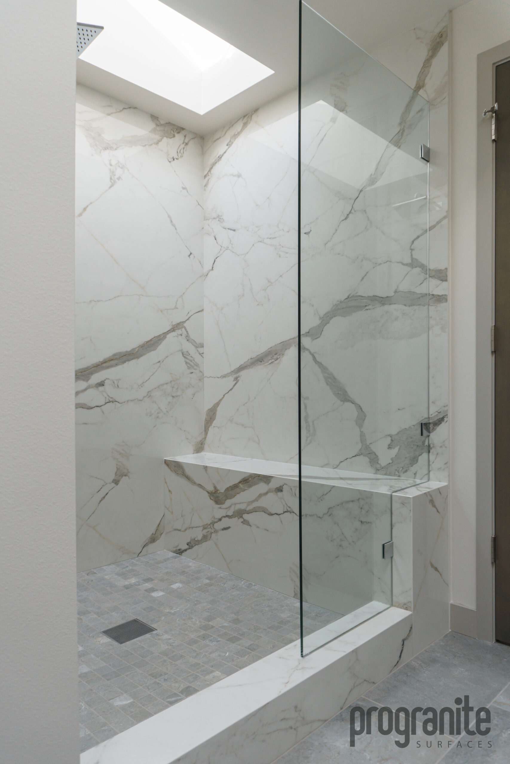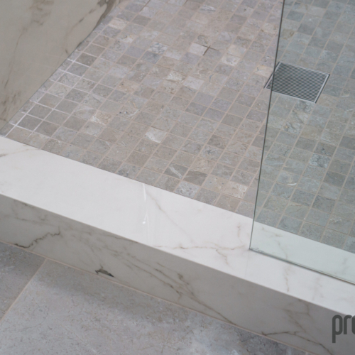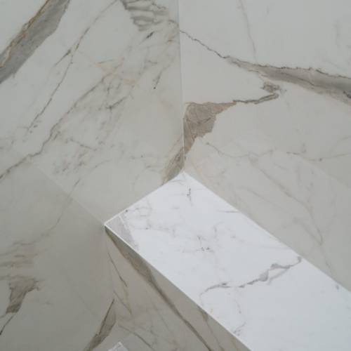 This elegant project showcases a seamless blend of modern design and timeless materials. The living room features a stunning fireplace wall clad in Dekton Helena Polished, paired with a matching hearth and mantle in MSI Concerto Polished, creating a sleek focal point that extends from floor to ceiling for a full-height backsplash effect around the fire feature. In the restroom, the white quartz restroom design shines with Porcelain Carrara Blanco shower walls, accented by bold gray veining that adds visual depth and luxury. The warm gray cabinetry and built-in shower shelf complement the tones of the shower wall, bringing balance and cohesion to the space while maintaining a sophisticated, contemporary aesthetic.