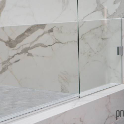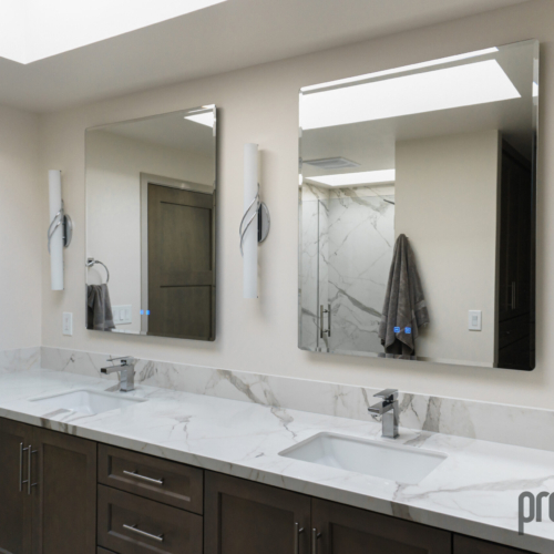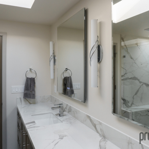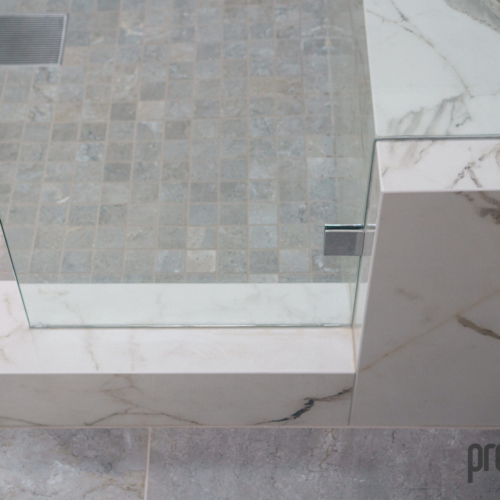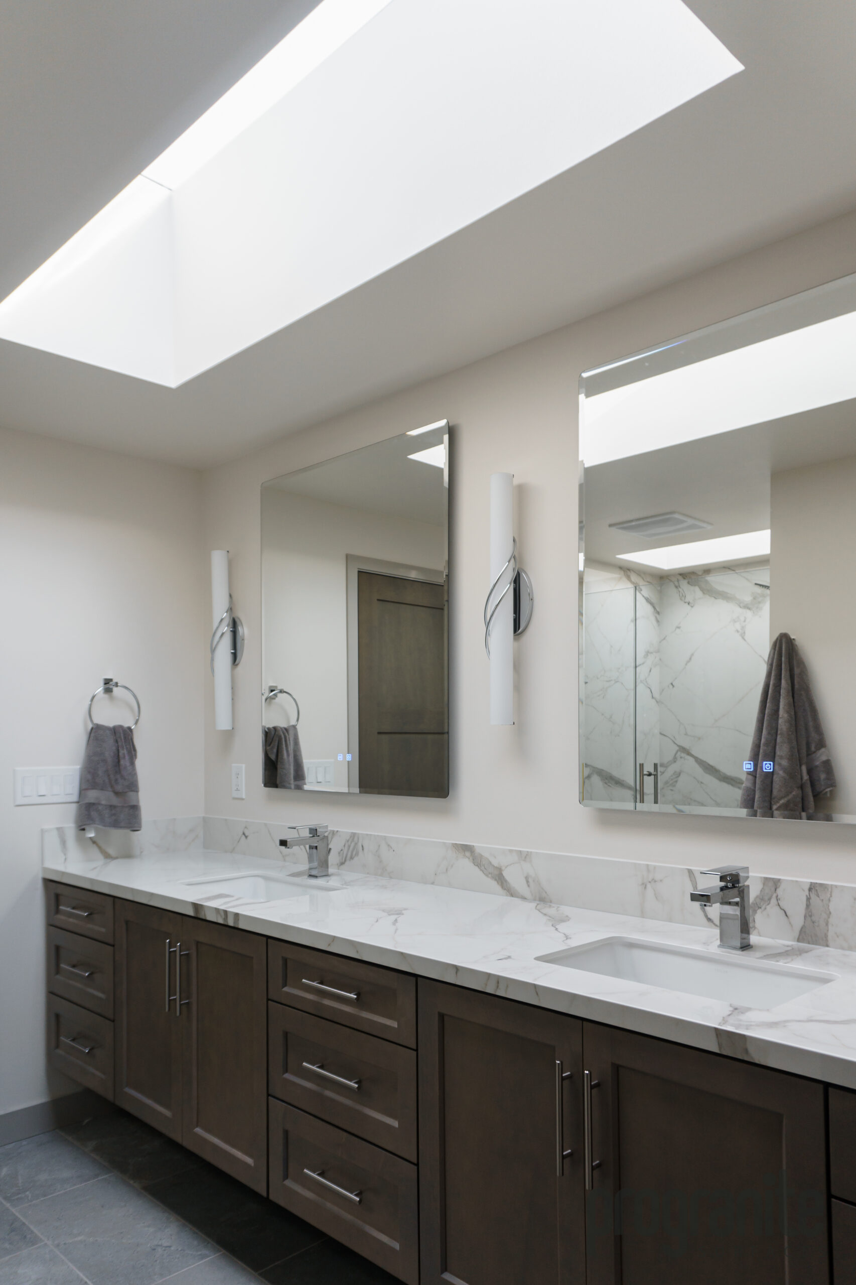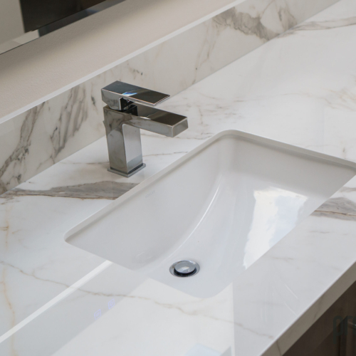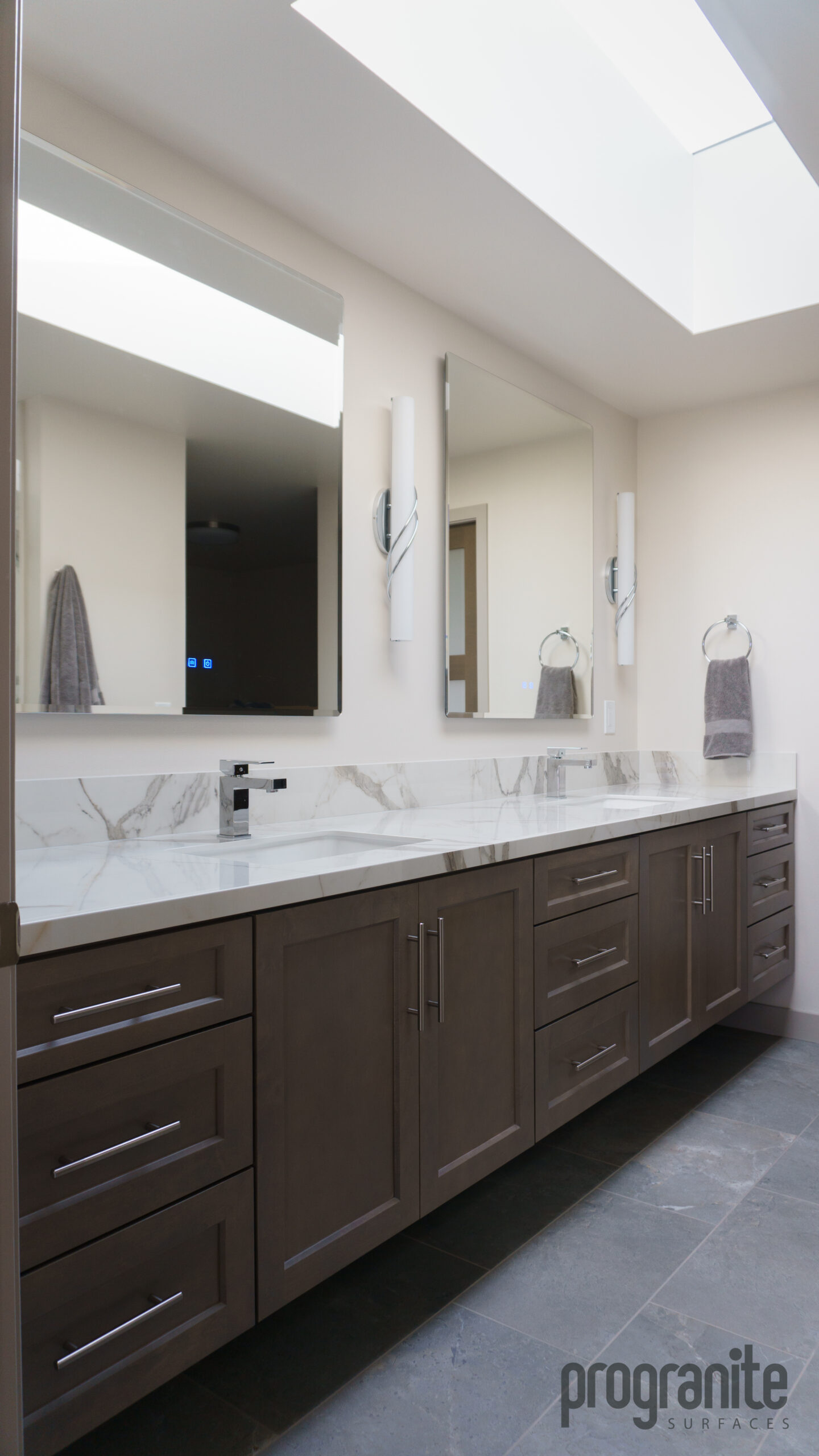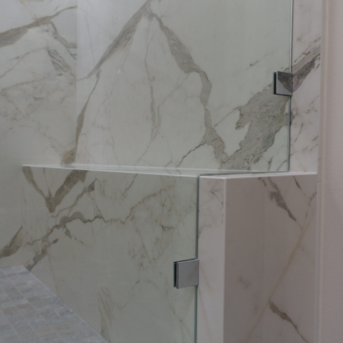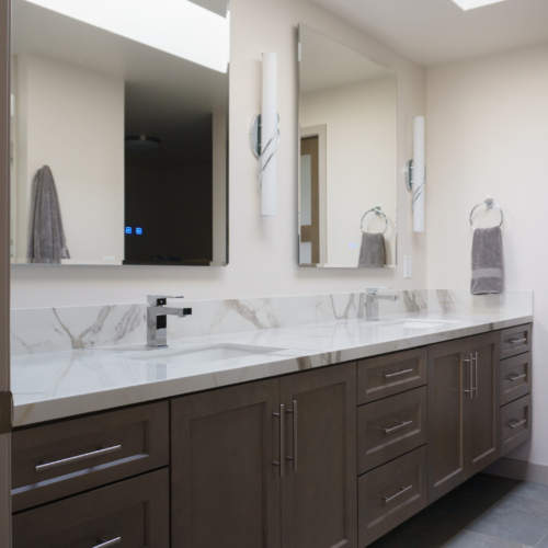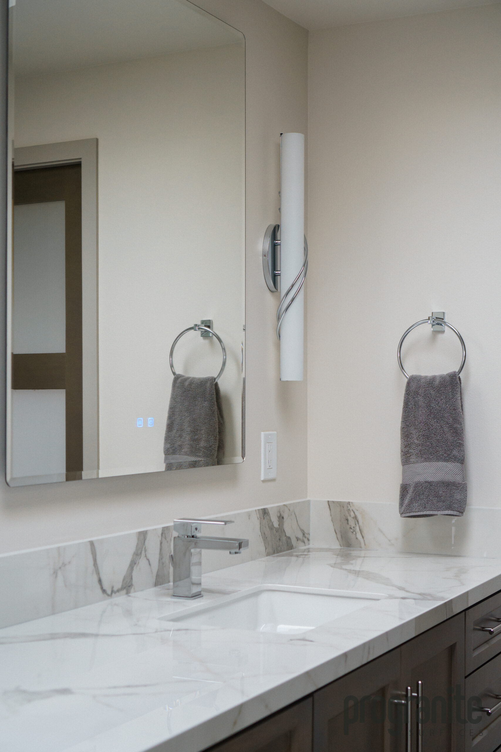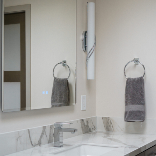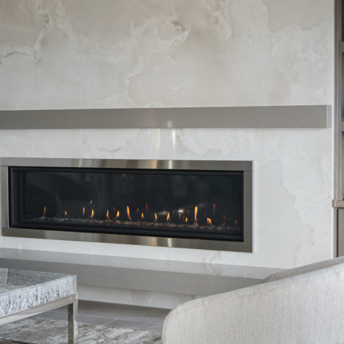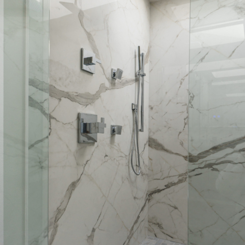 This elegant project showcases a seamless blend of modern design and timeless materials. The living room features a stunning fireplace wall clad in Dekton Helena Polished, paired with a matching hearth and mantle in MSI Concerto Polished, creating a sleek focal point that extends from floor to ceiling for a full-height backsplash effect around the fire feature. In the restroom, the white quartz restroom design shines with Porcelain Carrara Blanco shower walls, accented by bold gray veining that adds visual depth and luxury. The warm gray cabinetry and built-in shower shelf complement the tones of the shower wall, bringing balance and cohesion to the space while maintaining a sophisticated, contemporary aesthetic.
